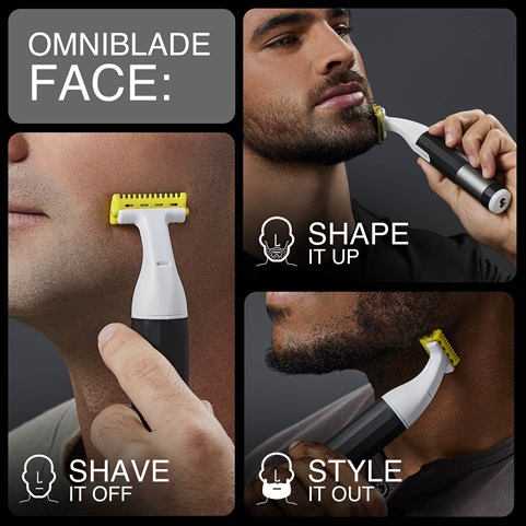 Get Complete Face Precision Styling with the Omniblade Face Groomer and its Removable Head and 7 Interchangeable Attachments. Its Blade is Guaranteed to Last For 5 Years** and the New Stamped and Ground Design gives a Close Cutting Performance to just 0.15mm*. With an Intuitive Design, you can enjoy complete styling control and perfect your look with up to 40-Minutes Cordless Usage Time.